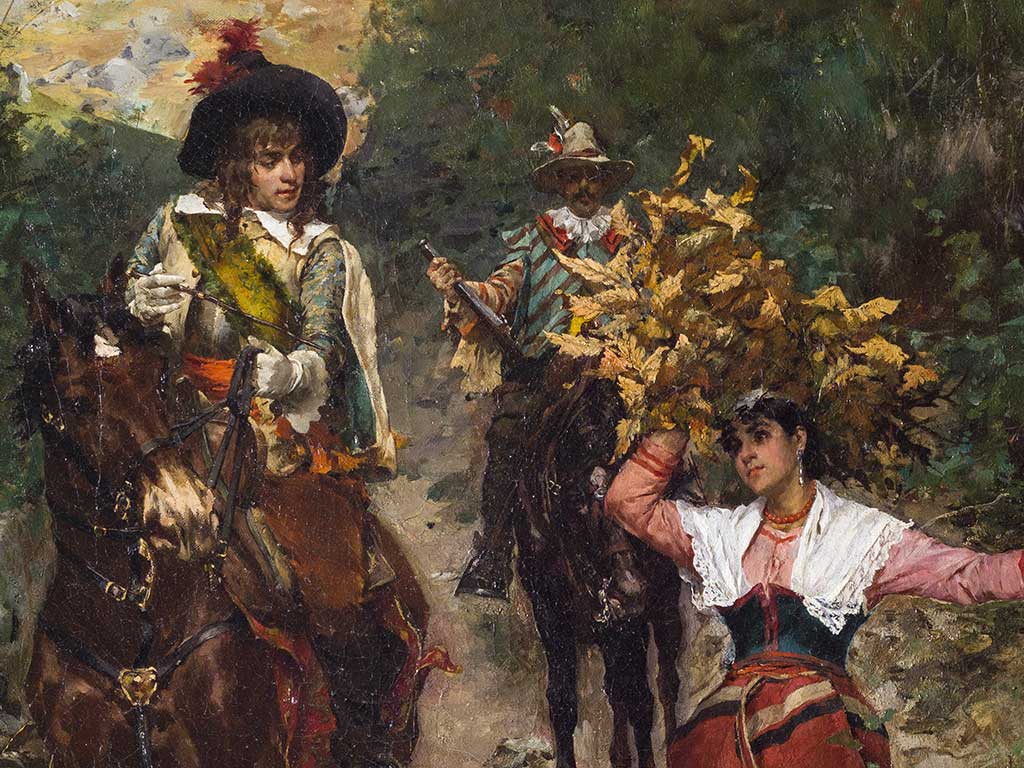 « Le tableau illustre la rencontre entre un jeune chevalier richement vêtu et une belle roturière sur un chemin de la campagne romaine. Le caractère anecdotique de l’œuvre est souligné par le titre, « Le bon chemin », et par les gestes amples des personnages. Le peintre parvient à rendre la scène éloquente surtout grâce aux descriptions minutieuses des expressions des visages, qui permettent au spectateur de comprendre pleinement les différentes personnalités des protagonistes, notamment grâce à la juxtaposition du regard fier de l’homme à cheval et du visage serein et confiant de la jeune fille ».