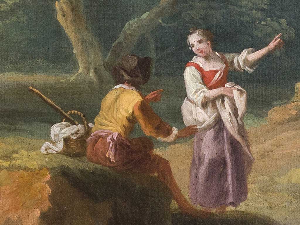 Cette scène de campagne délicate et aérienne, qui remonte probablement à la première maturité du peintre, vers le milieu des années 1860, met en évidence la grande habileté de Cignaroli à rendre les effets lumineux et atmosphériques, particulièrement perceptibles dans les légères variations chromatiques du feuillage des arbres, dans l’effacement progressif de l’horizon et dans la transparence argentée de l’eau. Un grand soin est également apporté à la représentation des personnages du premier plan, habilement construits par de rapides touches de couleur, et à la grande architecture de fantaisie qui se détache à l’arrière-plan de la scène.