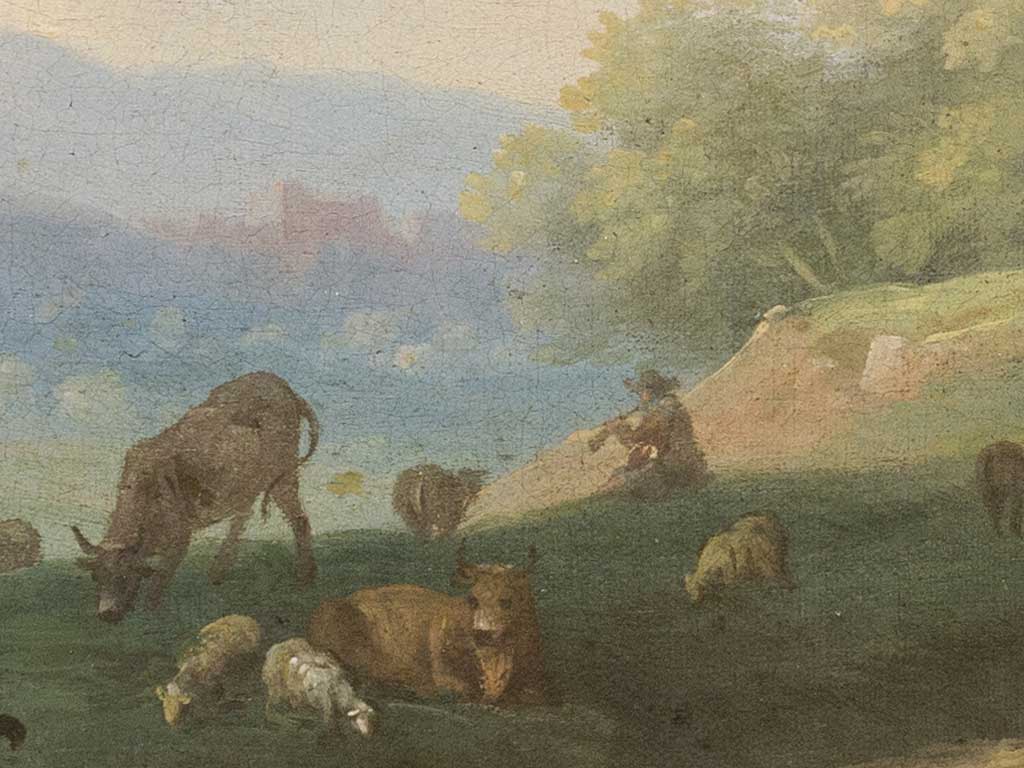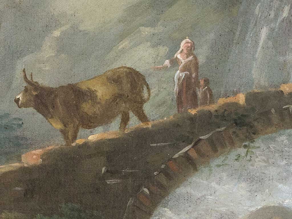 Titre: Paysage avec des voyageurs et des troupeaux près d’un pont