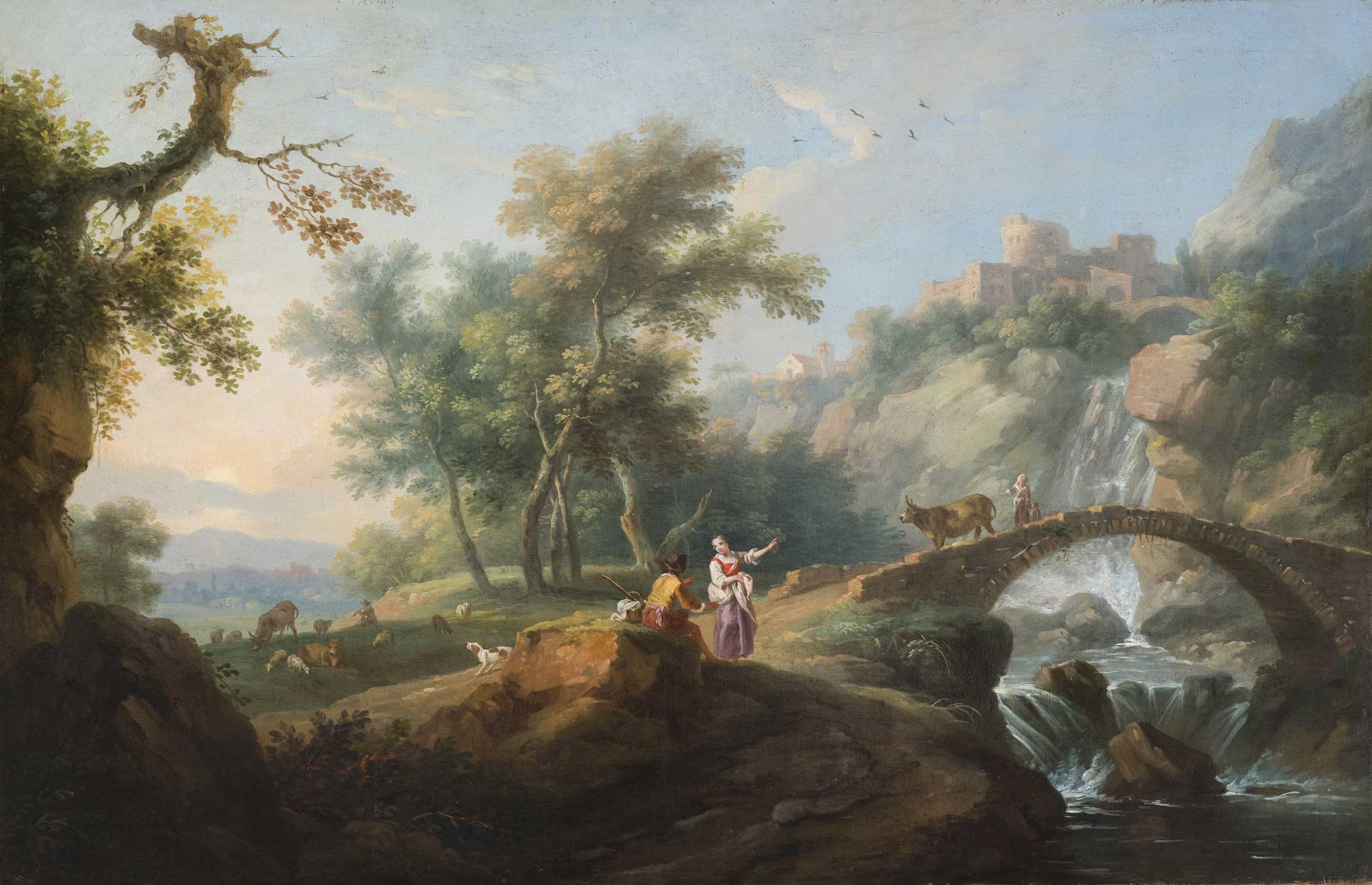 Vittorio Amedeo Cignaroli (Turin, 1730 – 1800), Paysage avec des voyageurs et des troupeaux près d’un pont